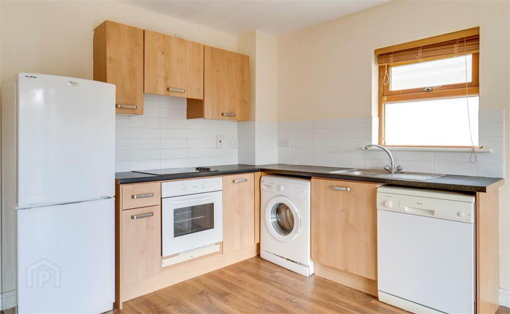 Fully fitted floor and wall kitchen units, electric cooker & hob, plumbed for washing machine and dishwasher, tiled splash-back.