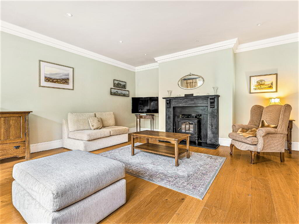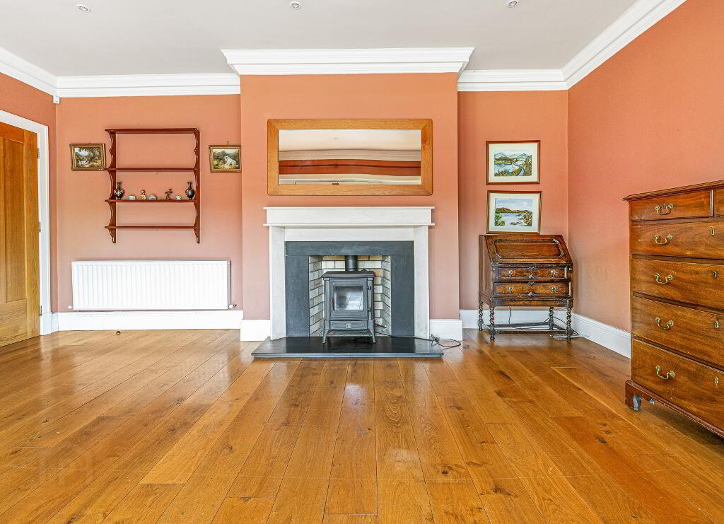 A most appealing Main Reception room. Generously proportioned. Furnished with an impressive French Limestone Fireplace fitted with a practical Solid Fuel Stove and the room is finished with solid Oak Hardwood flooring, attractive coving and quality drapes.