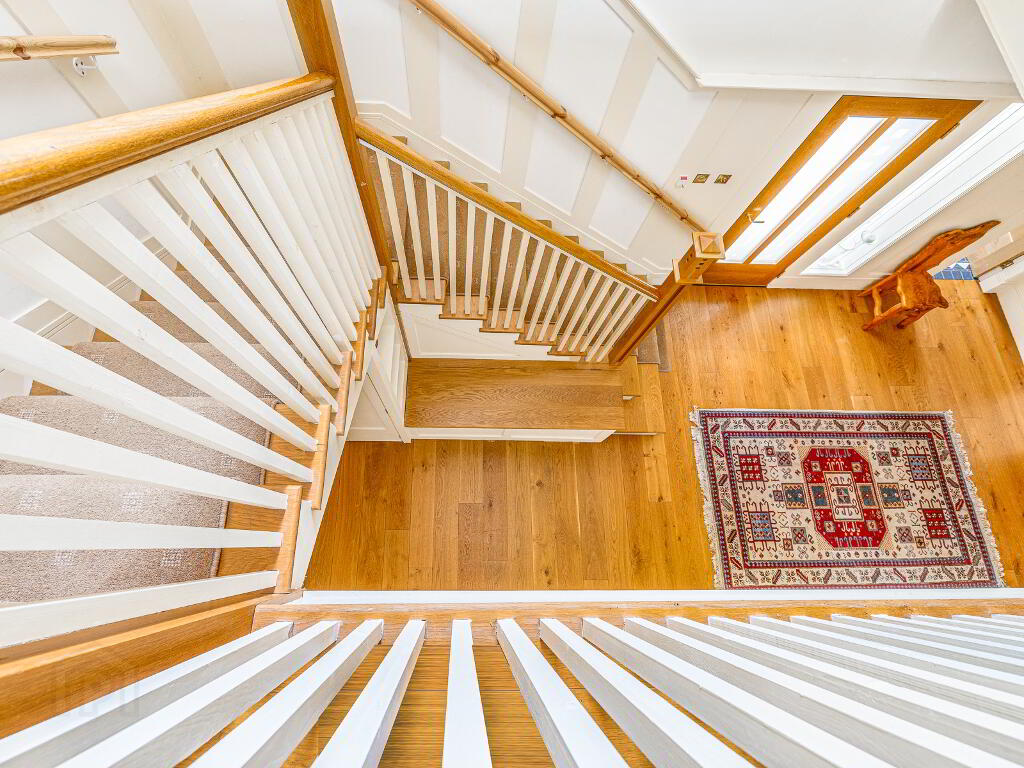 Serviced with Guest W.C. and a practical closet space. Wide-board Oak Flooring. An array of roof lights. Intriguing design.