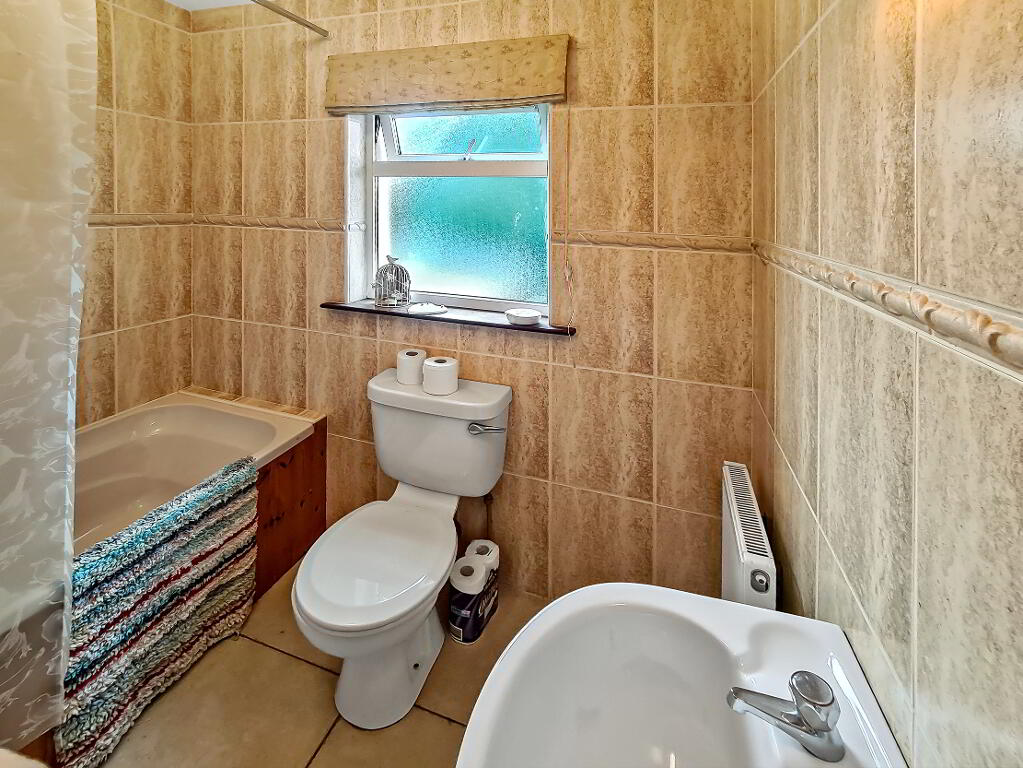 Bathroom:- 2.1 x 1.75 - Tiled, WC, wash hand basin, bath.