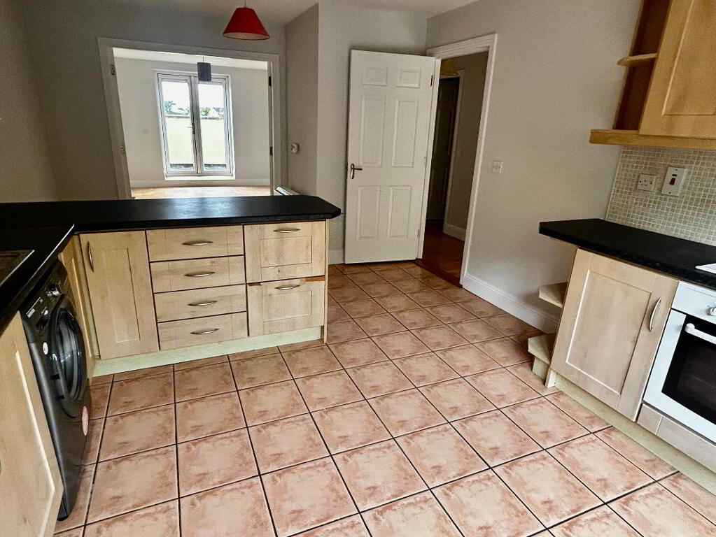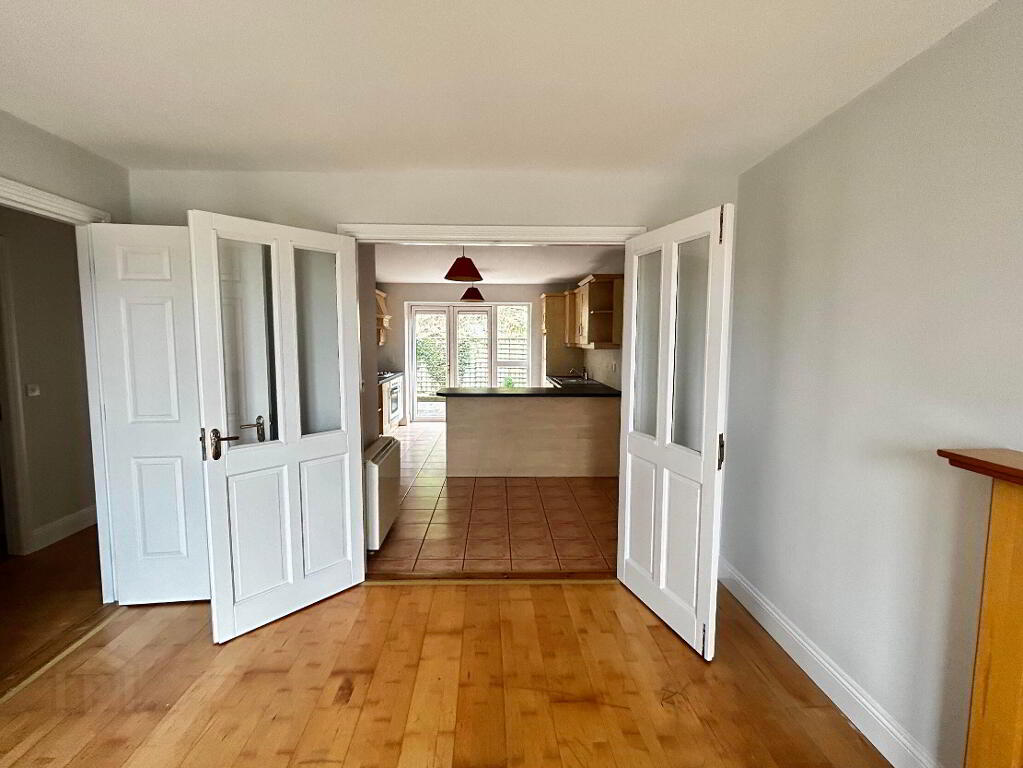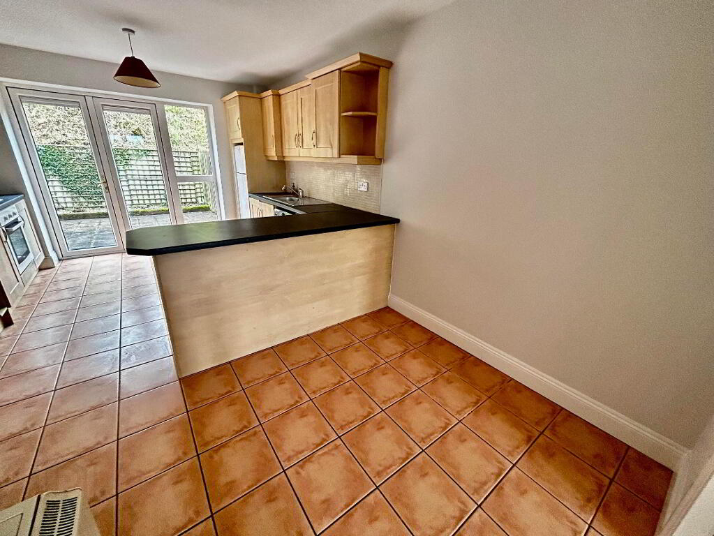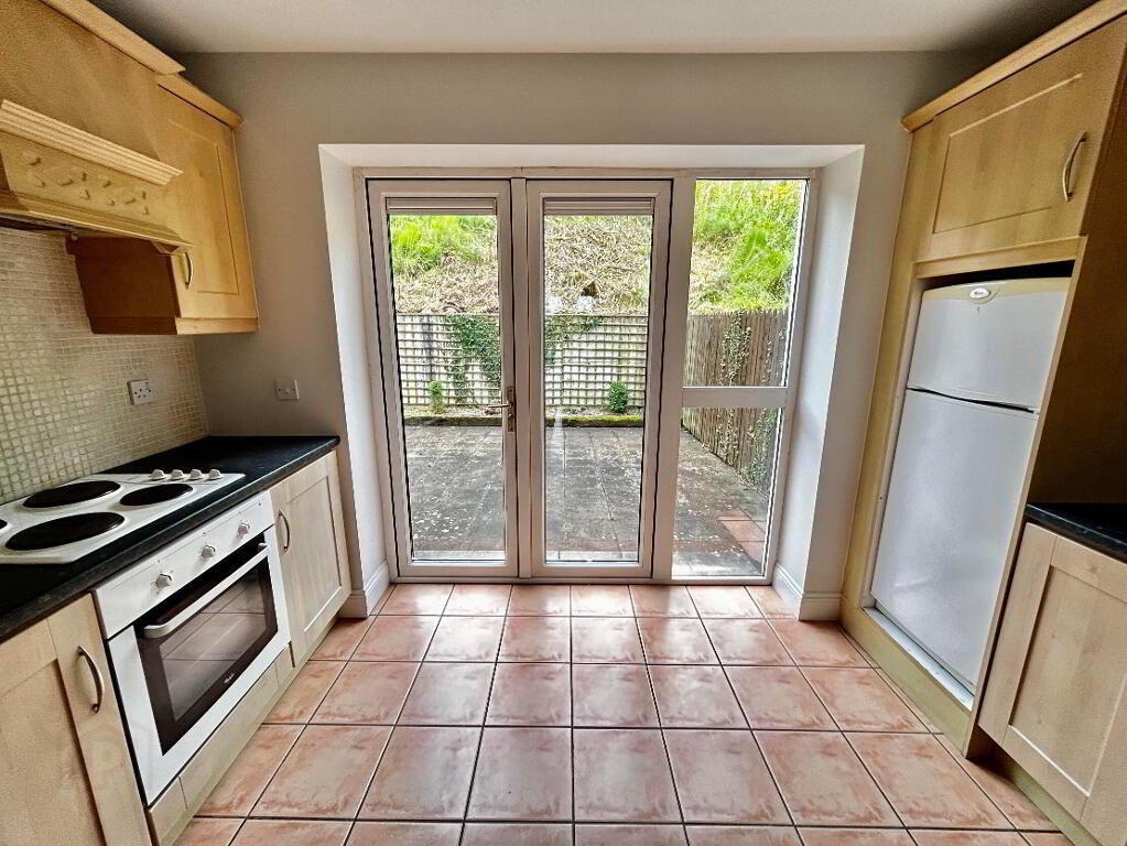 5.30m x 3.52m Kitchen/dining room opening into the living room and with double glass doors opening into the garden, with a single drainer sink, built -in cabinets, a fridge, a washing machine, an electric oven, power points, with a tiled floor and splash back