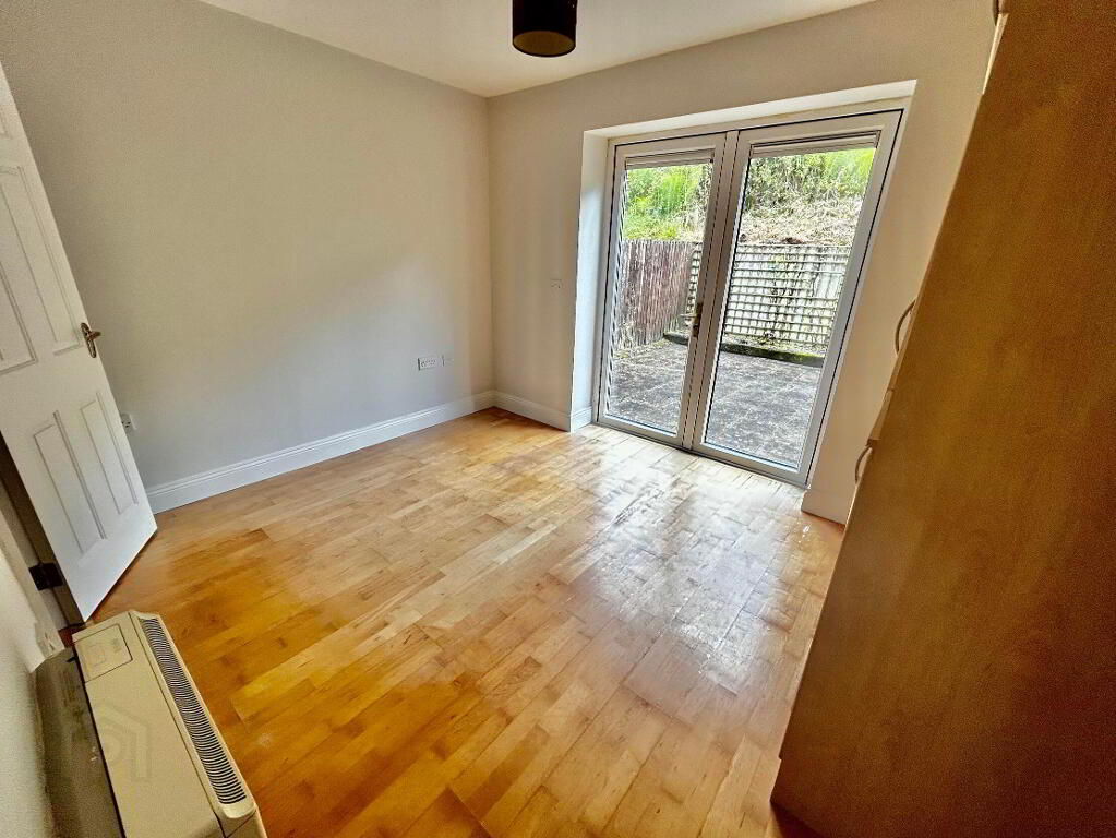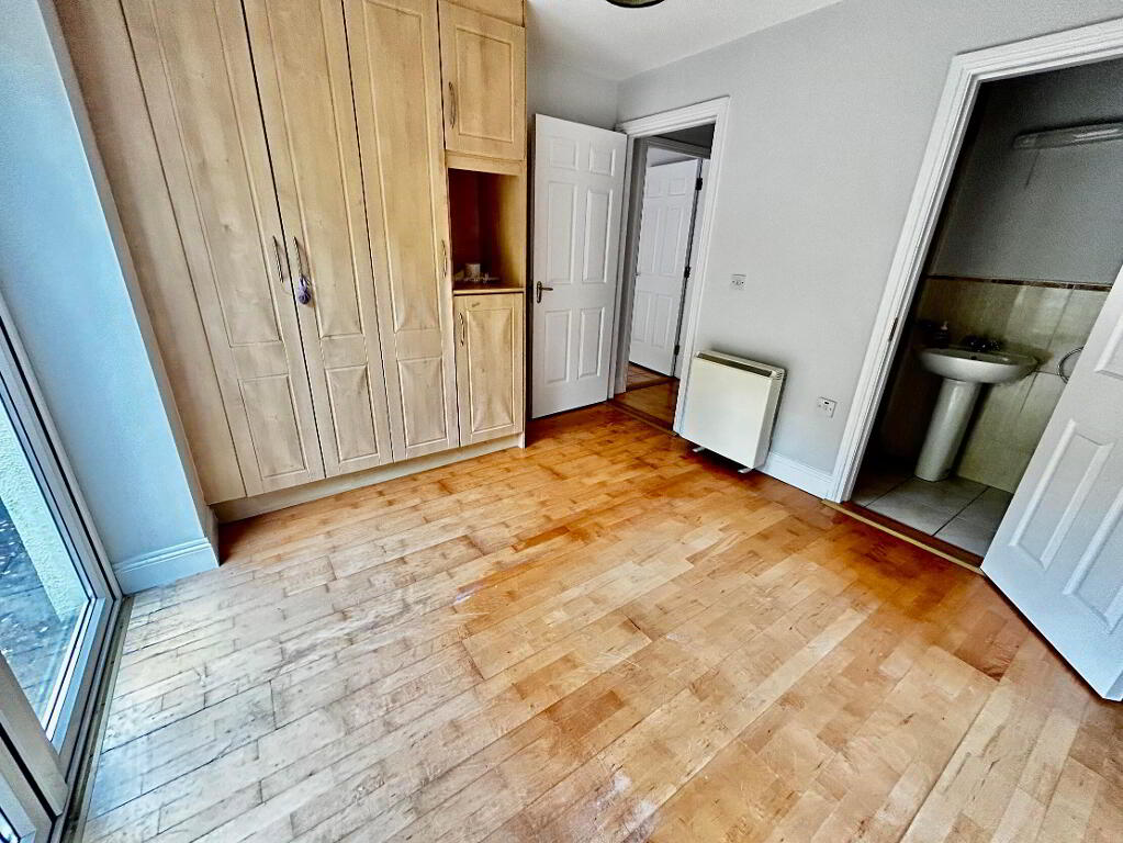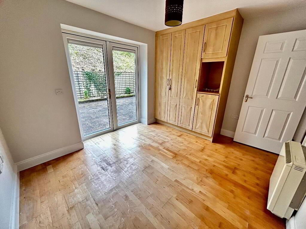 3.56m x 2.88m Bedroom with an en-suite and double doors opening into the back garden, with a wood panel floor, built-in wardrobes and cupboards, power points and an electric radiator