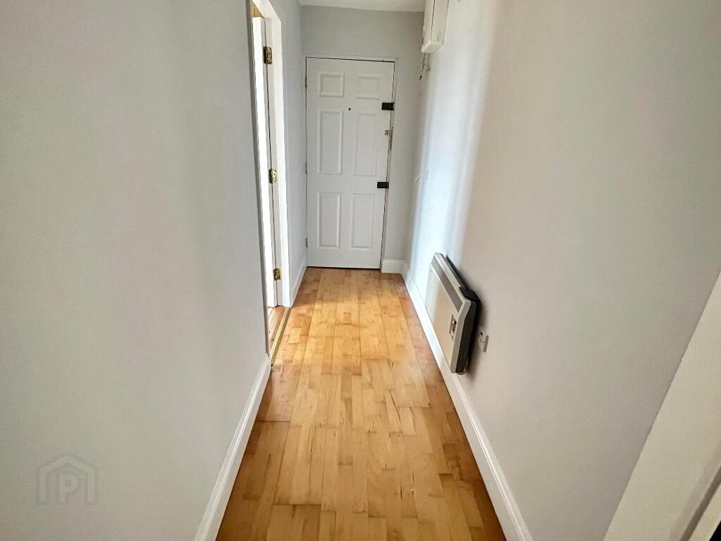 3.08m x 1.10m Entrance Hallway with front door to common corridor, with a wood panel floor and an electric radiator