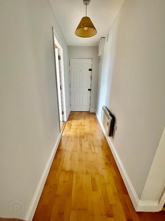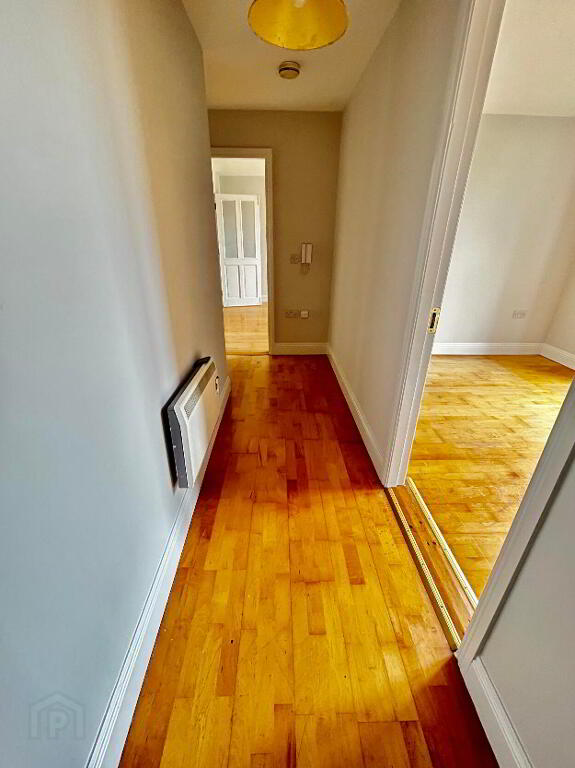 4.22m x 1.09m Hallway with wood panel floor, Power points and a hot press