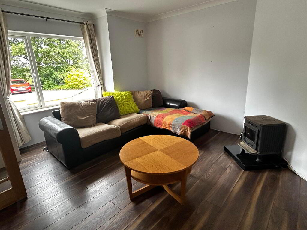4.09m x 3.60m Living room with laminated flooring to the front of the house, open fireplace, electric storage heating, power points and tv point, window to the front.