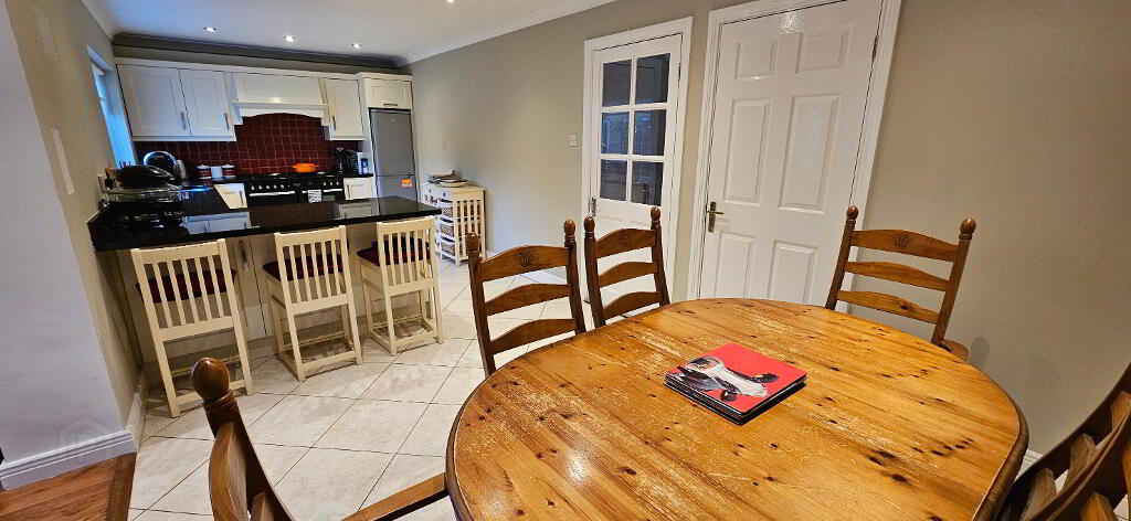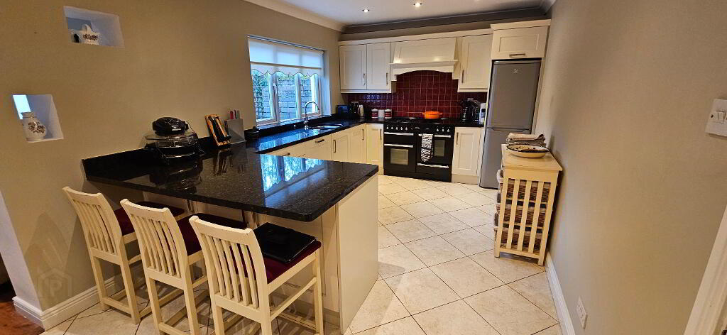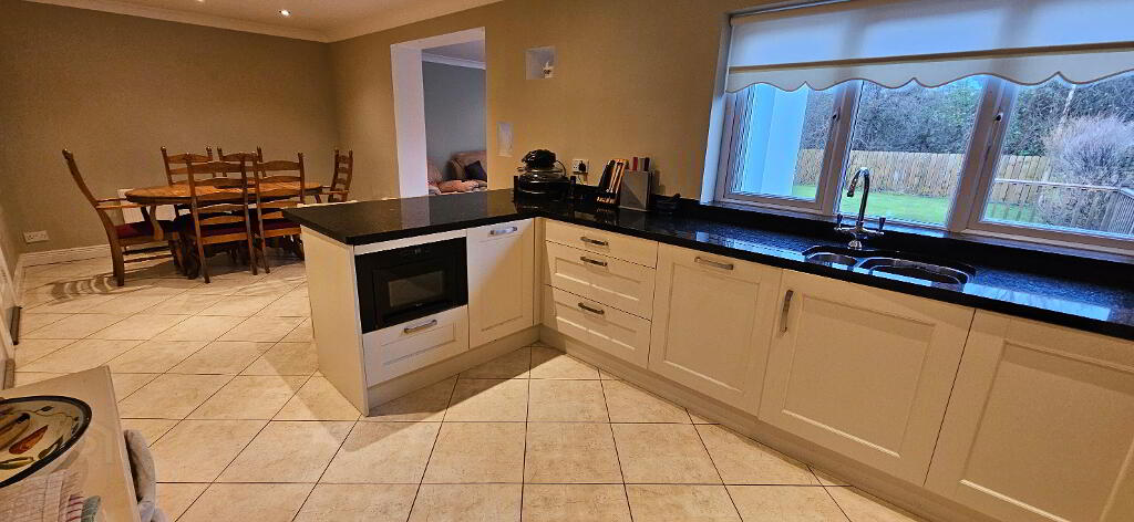 7.70m x 2.38m Recessed lights, ceiling coving, fitted shaker kitchen with breakfast bar, granite worktop, tiled floor, tiled splash back, power points, integrated dishwasher, radiator.