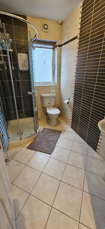 2.28m x 1.96m Tiled floor, fully tiled walls, extractor fan, corner shower with pumped shower unit, whb, wc, heated towel rail/radiator.