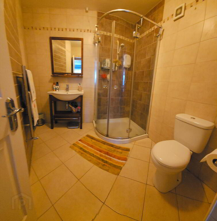 2.57m x 1.58m Tiled floor, fully tiled walls, wc, whb, corner shower with electric shower, heated towel rail/radiator, extractor fan.