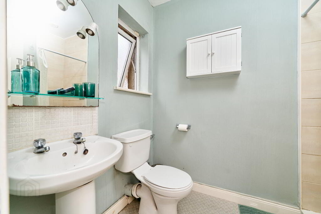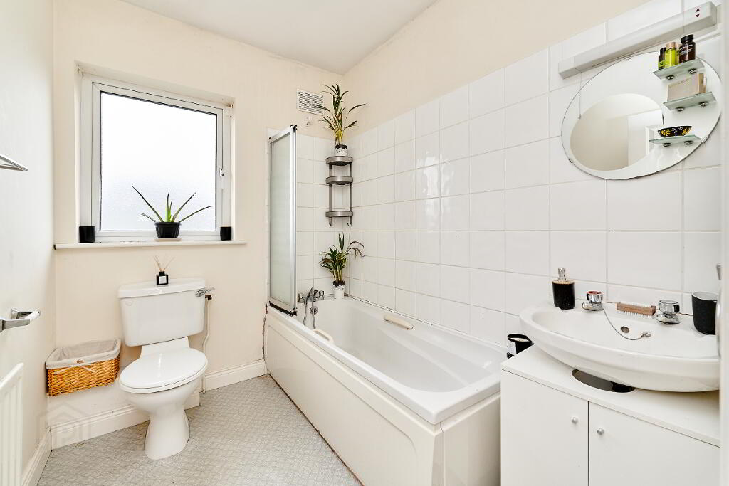 Bathroom 2.37m x 1.89m - WC, WHB & bath. Partially tiled walls.