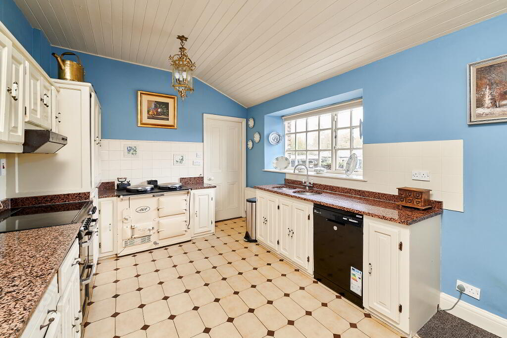 Moving on you enter the living room, that features parquet floors, a marble fireplace and mantle, complete with a solid fuel burning stove. This is a lovely cosy room that the current owners use on a daily basis. The kitchen looks out onto the rear of the property and features high and low shaker style cupboards and granite counter tops. The heart of the kitchen is the cream two oven oil fired Aga cooker. The adjoining utility room is plumbed for washer, dryer and American style fridge, this room may also be used as a pantry.