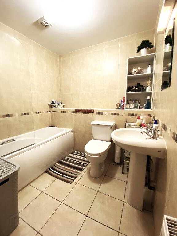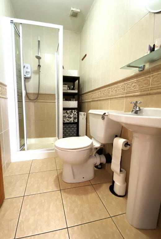 En Suite: Part-tiled walls and fully tiled floor. Shower cubicle with Electric Shower. Toilet and WHB.