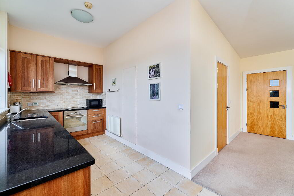 Kitchen 4.90m x 2.38m Fully fitted kitchen with granite worktop, electric cooker, fridge-freezer, washing machine, dishwasher. Tiled floor.