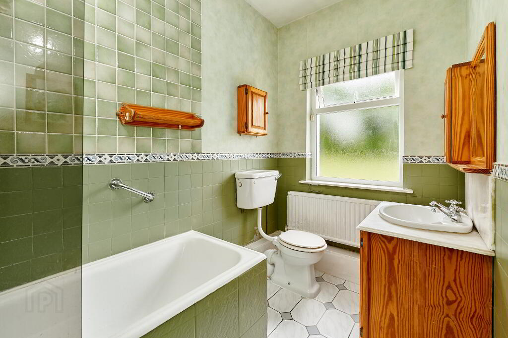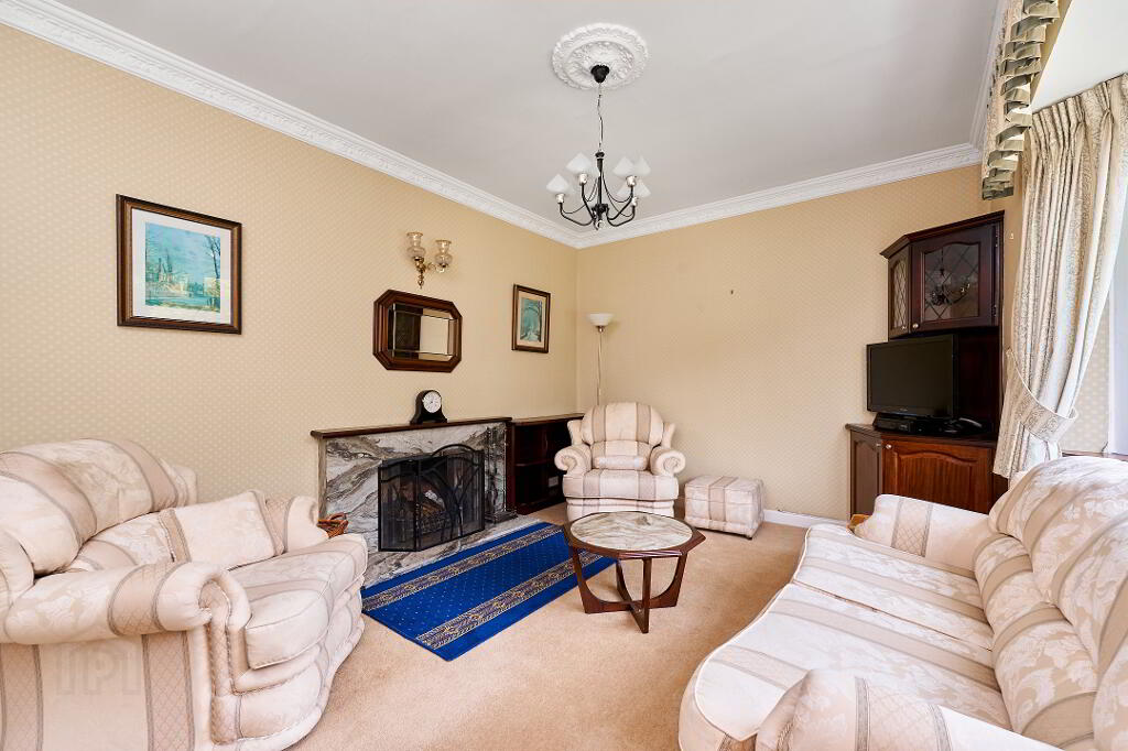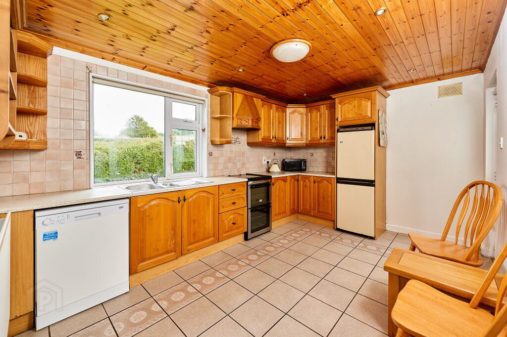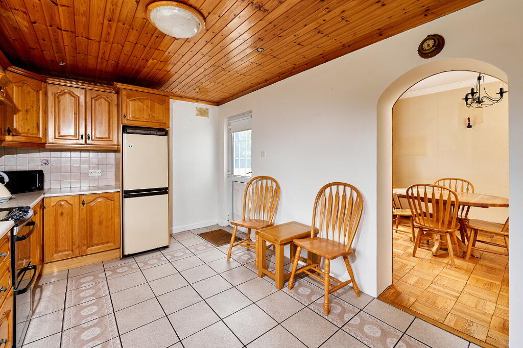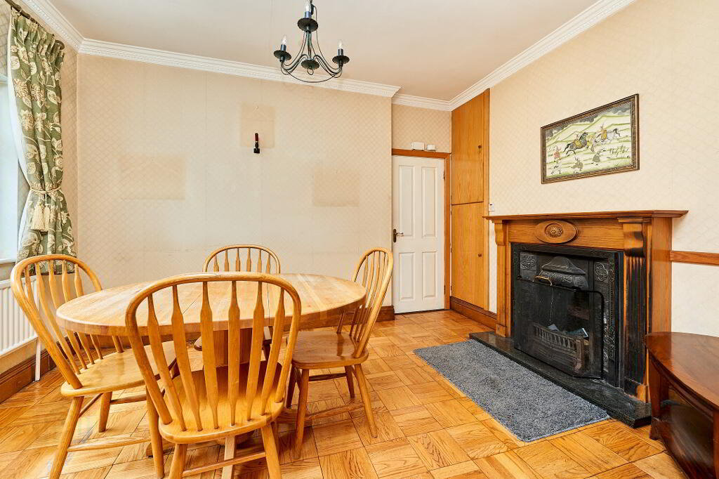 The hallway continues, turning to the left past a bathroom and hot press, and opens into a hardwood floored dining room, that also features an open fire and large south facing window bringing great natural light and views over your back garden. The dining room gives way to kitchen and back door.