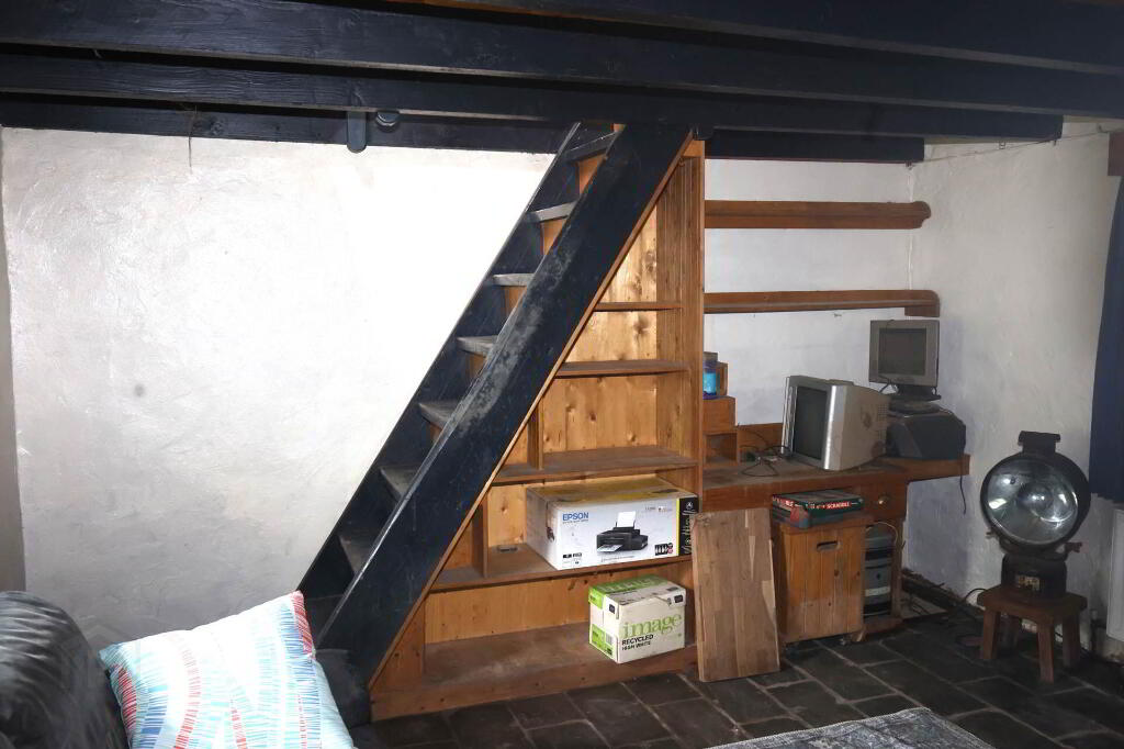 Original Fireplace with solid fuel stove insert, original stone floor, exposed timber ceiling beams, belfast sink, fitted presses and shelving