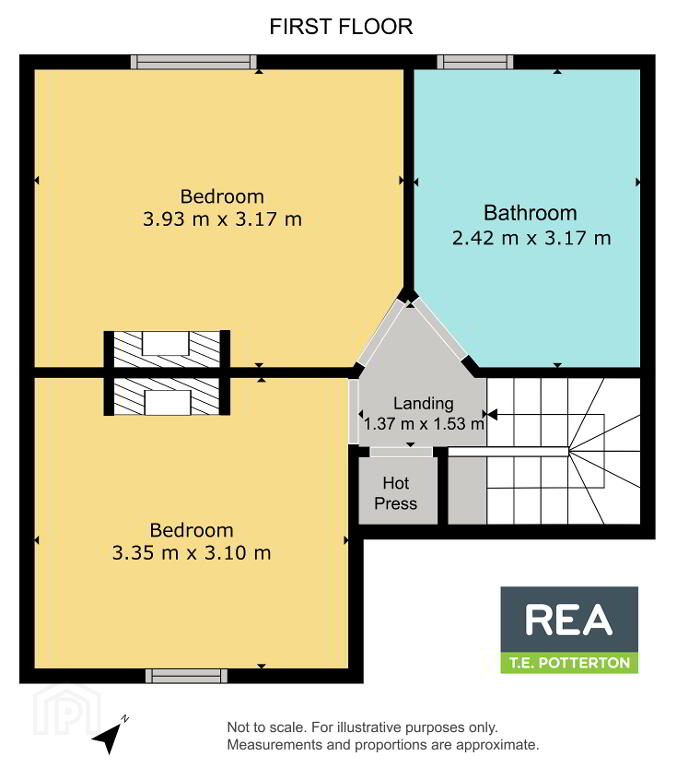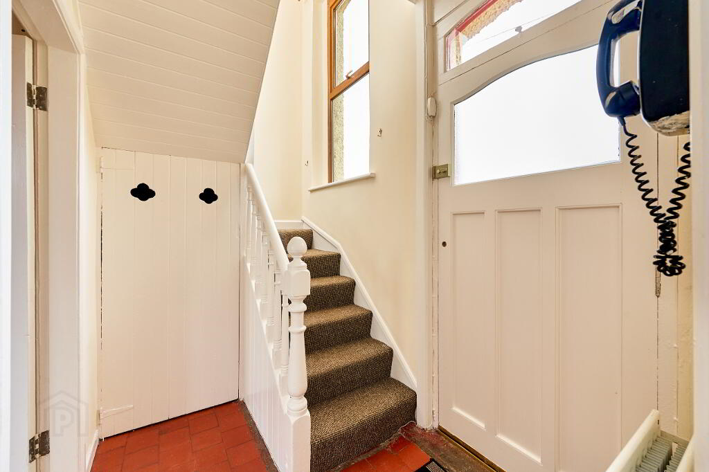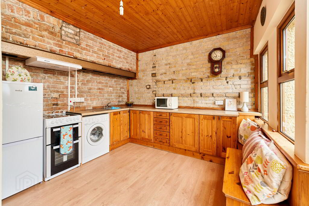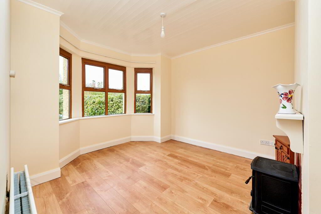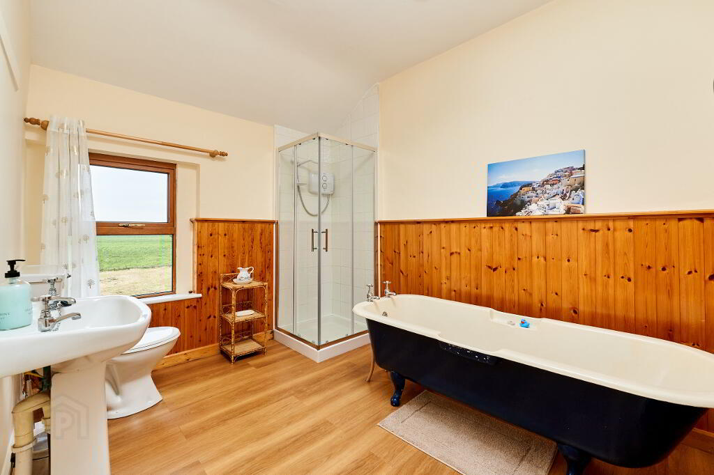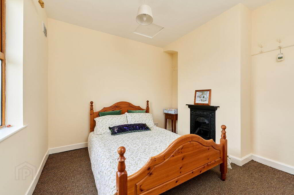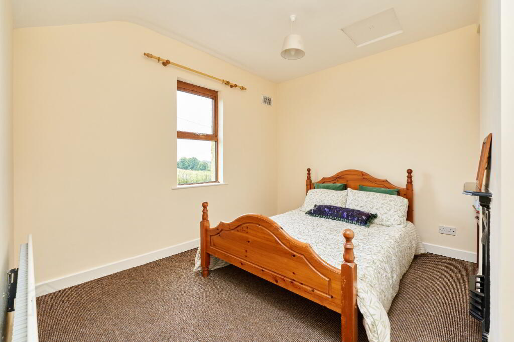Carpeted staircase guides to the first floor with storage and hot-press alike, both bedrooms feature open fireplace, the master of which benefits southerly aspect and carpeting, the second bedroom has seen installation of energy efficient upgraded LED spot lights, the shared family bathroom boasts a cast iron standalone bath with new fixtures and electric shower fitted.
