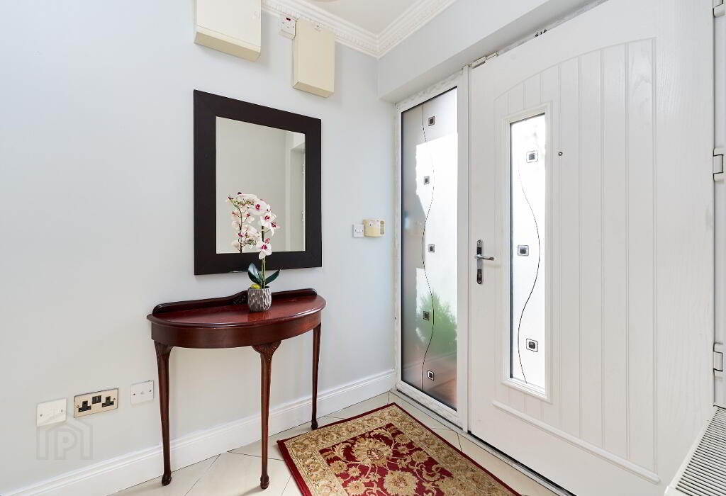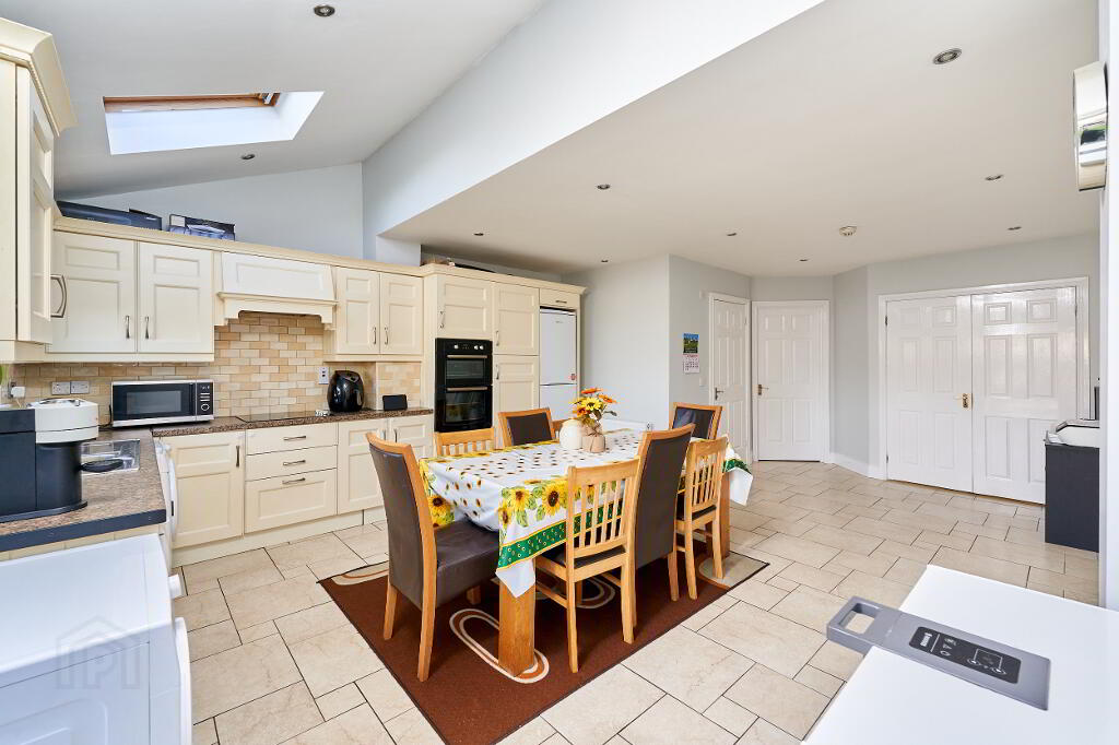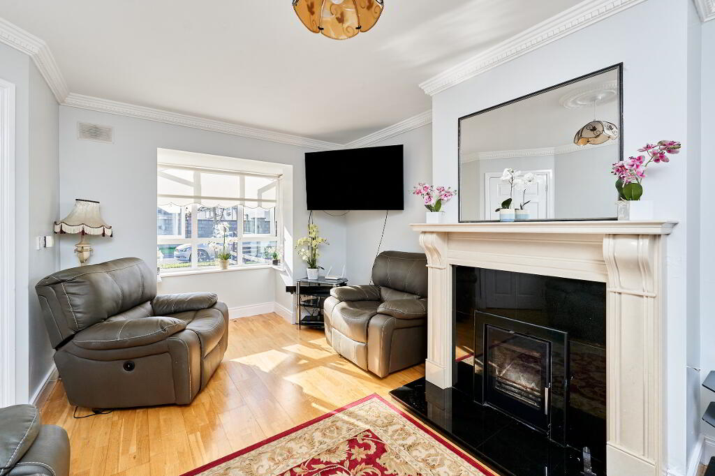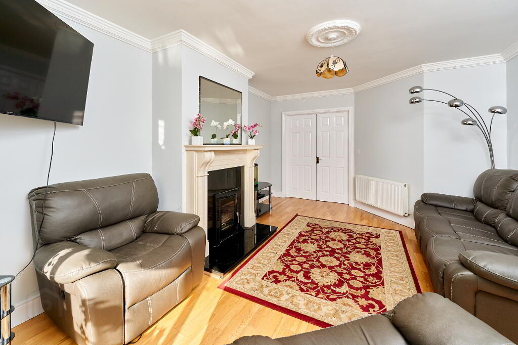 Stepping through the front door into entrance lobby one turns left into a spacious and contemporary family living room, featuring a commanding fireplace with insert solid fuel burning stove and solid wood flooring.