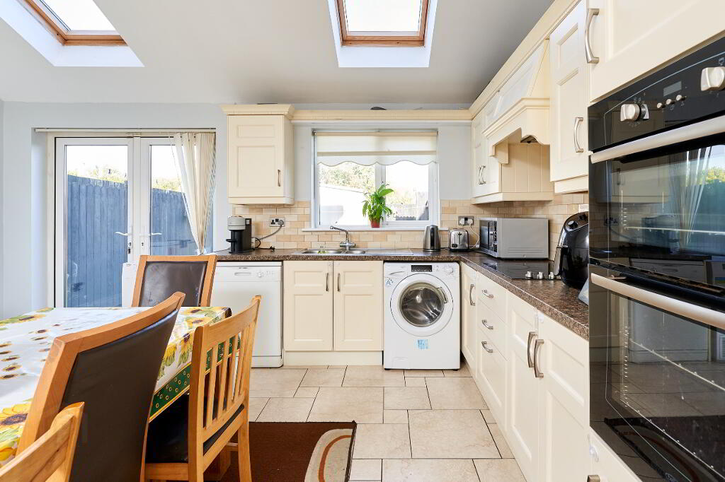 The living room gives way too to a vast open-plan kitchen, with double oven and country-living style units, double French doors and two skylights bathe the rear of the property in natural light and bring the outside in. A downstairs WC completes the ground floor.