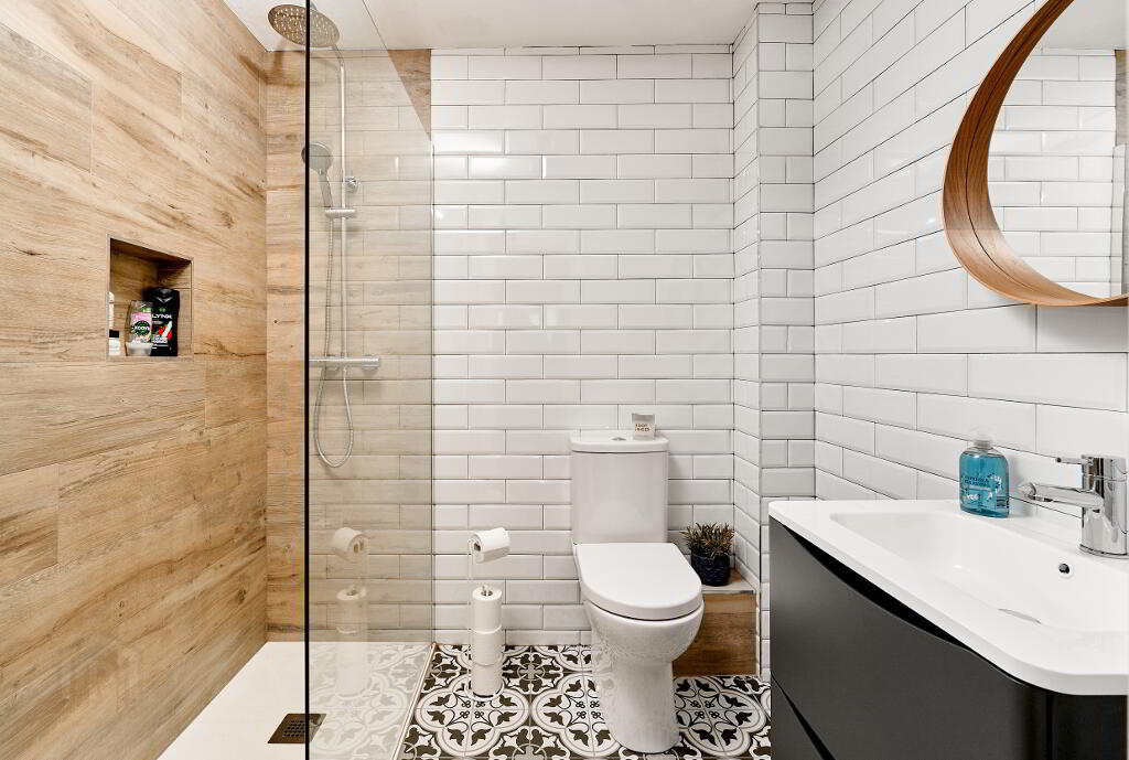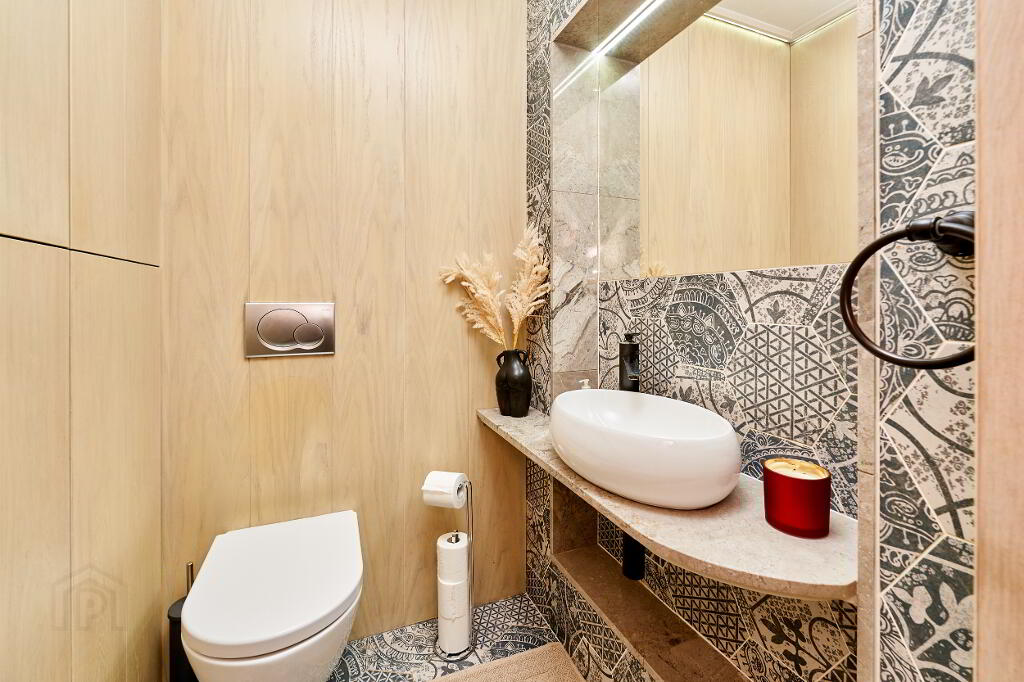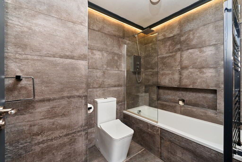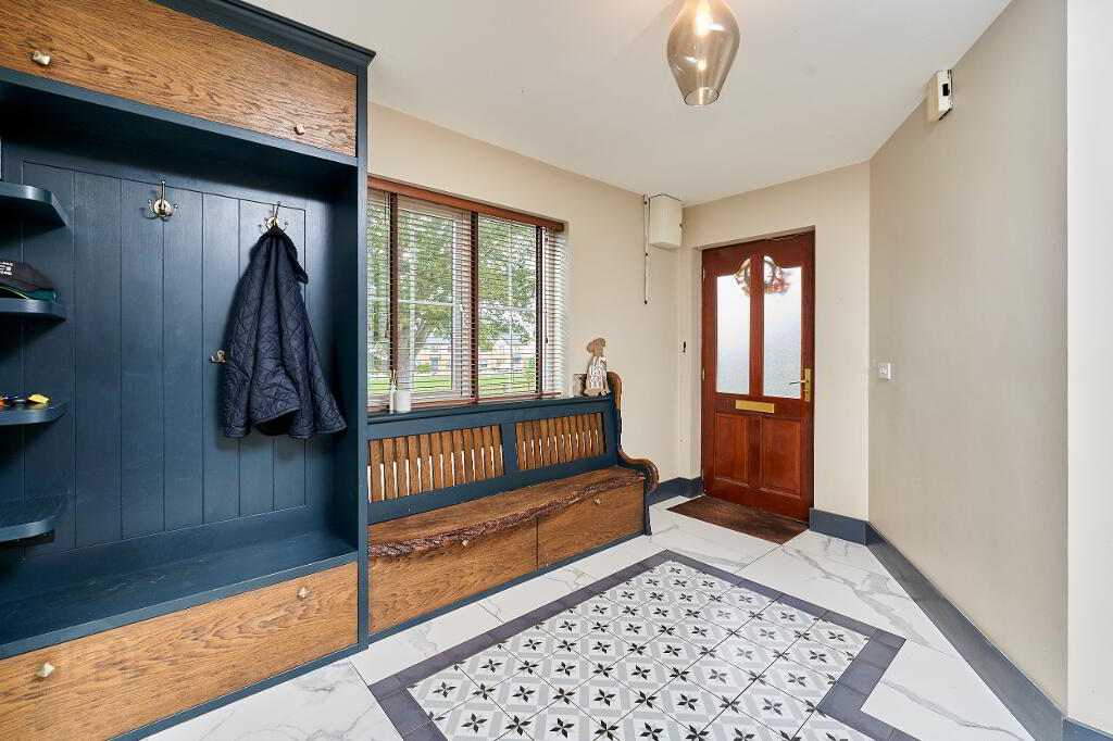 Front patio overlooks communal green space and large windows flood natural light internally, stepping through the front door one is greeted with an almost country farmhouse style boots room look and vast entrance hallway that guides past downstairs WC that is fitted with LED surround strip lighting.