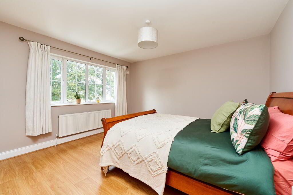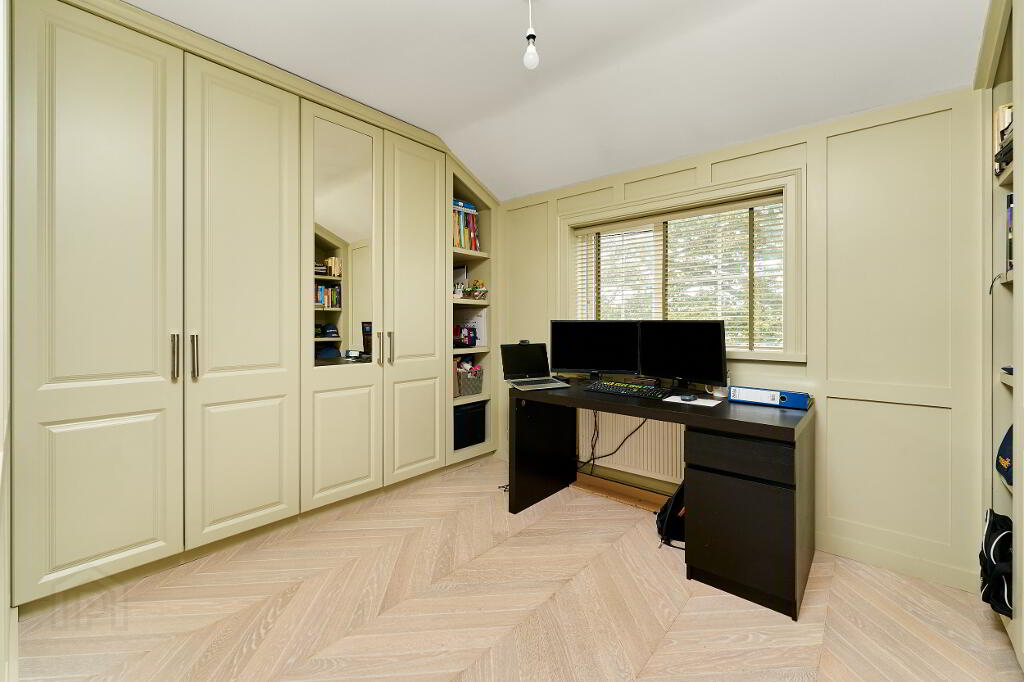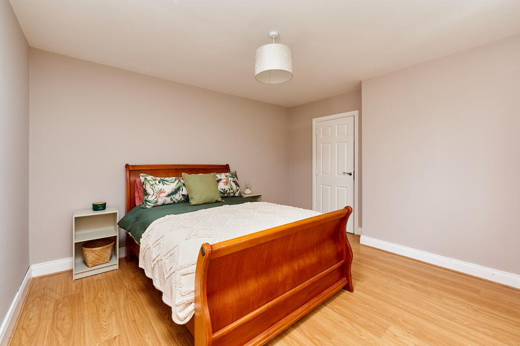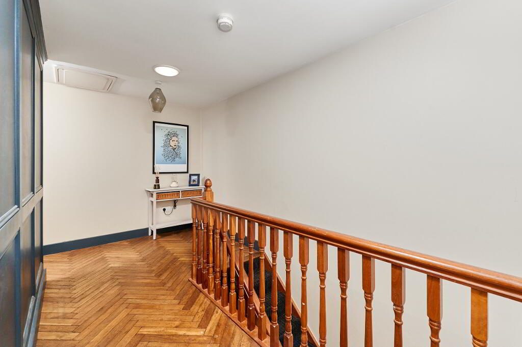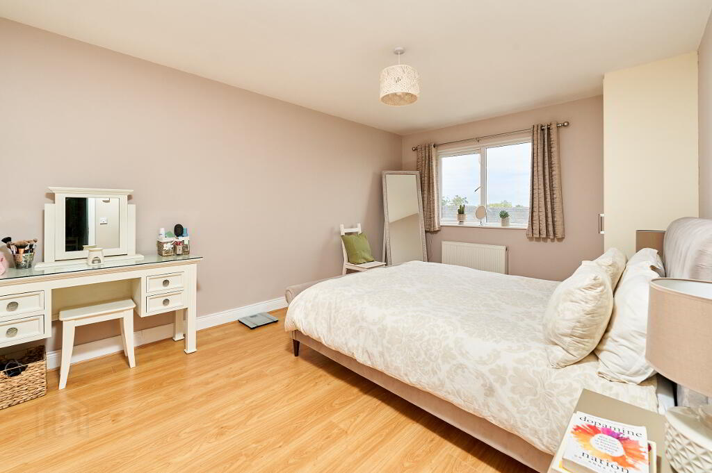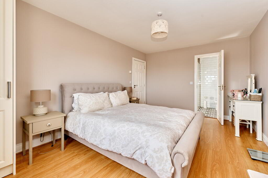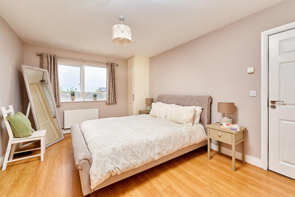 Carpeted staircase guides to a spacious landing, featuring hardwood herringbone flooring and paneled wall encompassing a hot press. Leading through to bedroom one that is currently being utilised as a home office and on to the guest quarters. Hallway wraps around to a spare bedroom and past shared family bathroom, once again strip LED lighting give ambiant glow to offset dark tiling, featuring a bath and heated towel rail. The master suite completes the accommodation, boasting space for vanity units and a sizeable en-suite.