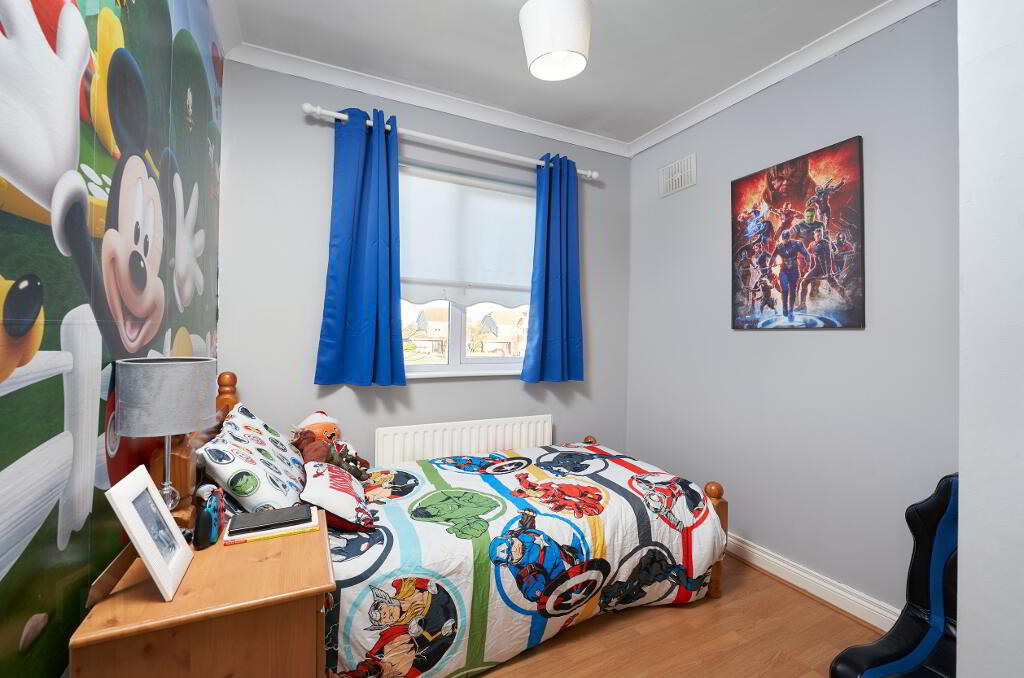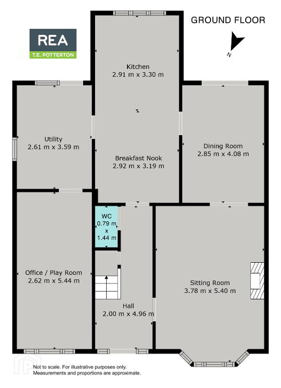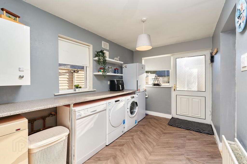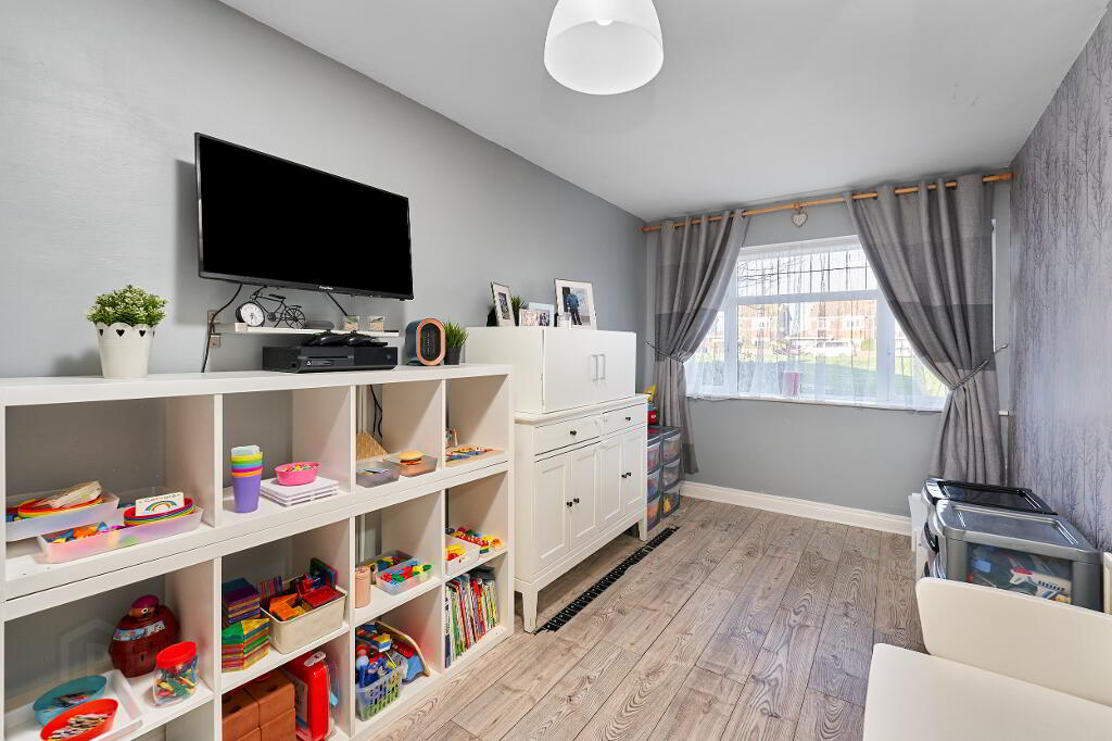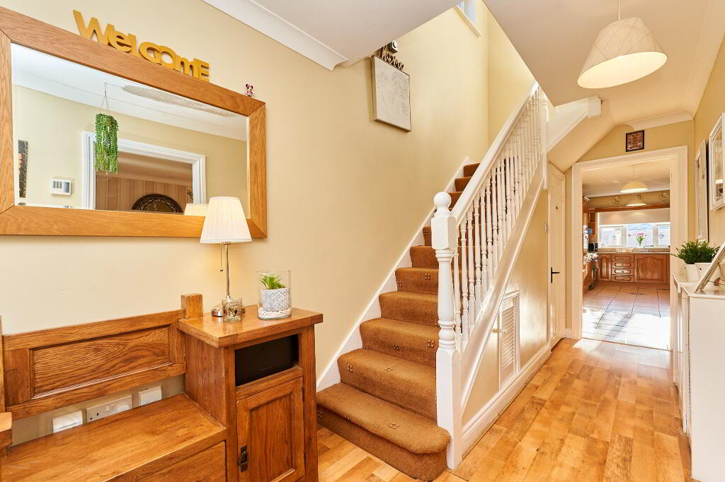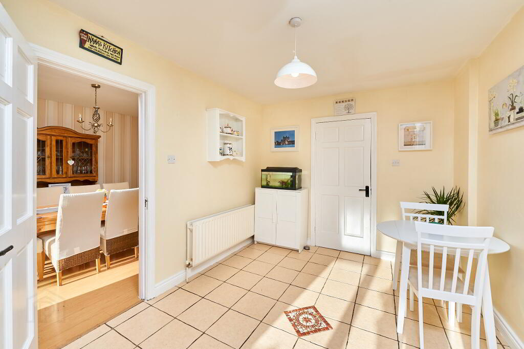 Front door opens into a welcoming hallway, featuring hardwood floors, guiding through to your spacious new family sitting room, complete with open fire and bay window. The living room gives way to a south facing dining room, perfect for entertaining and hosting large family gatherings, with access via sliding French doors to back garden area. Dining room feeds into an open plan style kitchen, with plenty of space to accommodate a breakfast bar and a huge utility come laundry room that guides through to further office space, currently being utilised as a children’s playroom. A downstairs WC completes the ground floor accommodation.