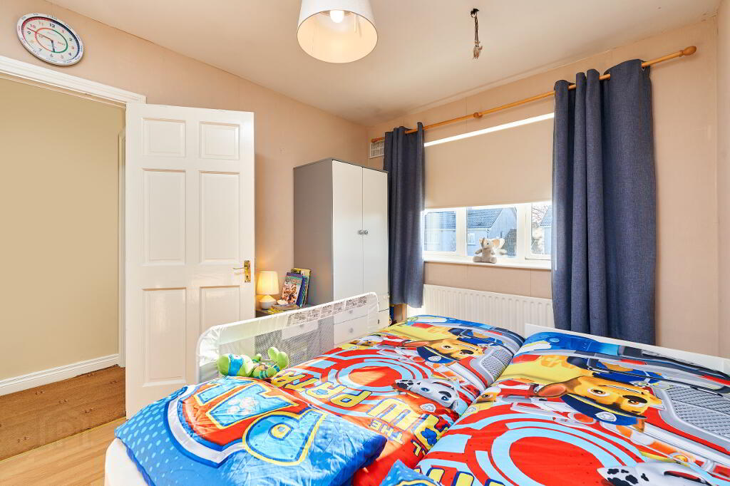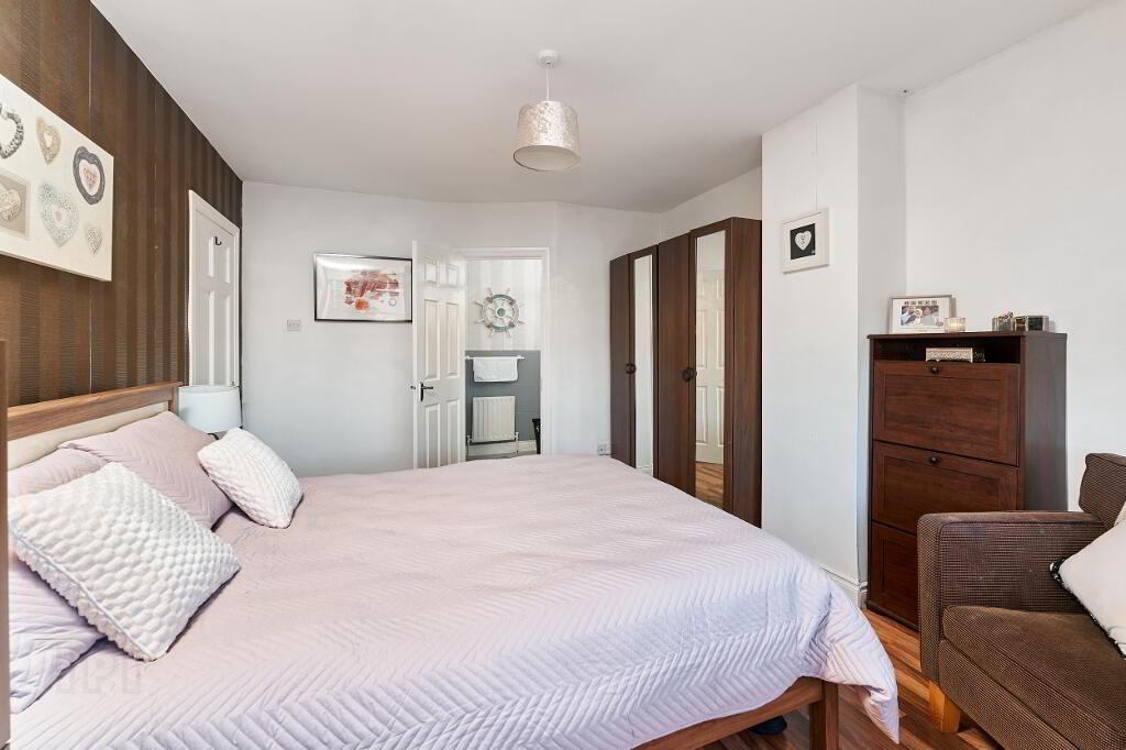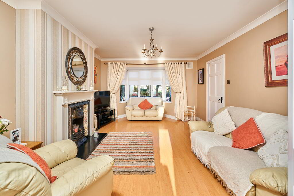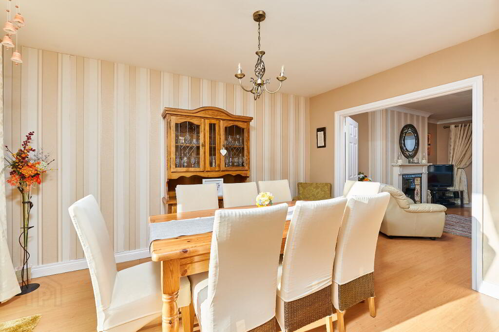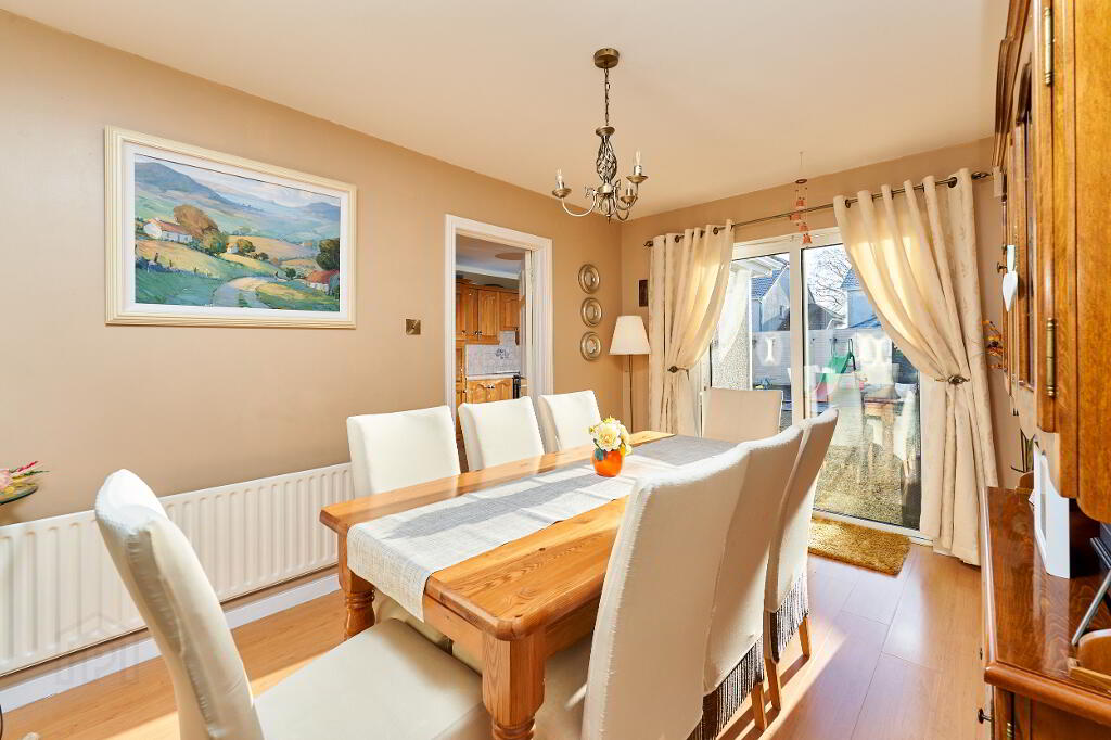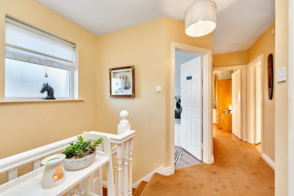 Carpeted staircase leads to the first floor landing featuring a double hot press. Three spacious bedrooms all with ample storage and wardrobe space, the fourth bedroom comprising the master, having the benefit of being en-suite.