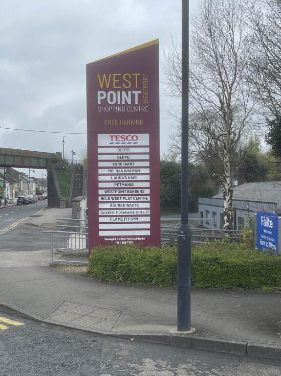 Westpoint Shopping Centre is located on Altamount Street at the entrance to Westport beside the railway station. It is a thriving, modern shopping centre, anchored by Tesco. Other occupiers include Boots, Petmania, Wildwest Children`s Play Centre and Euro Giant.