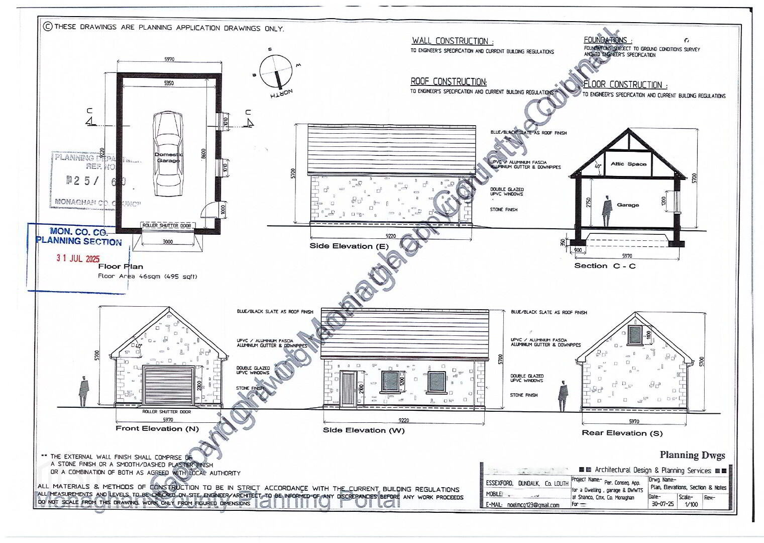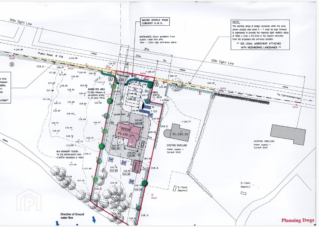 A prime residential site of 0.8 acre with Full Planning Permission for a two storey and a garage located along the R178 Carrickmacross to Shercock road convenient to the Meeting House at Corvally, 7 km from Carrickmacross, 6km from Shercock.