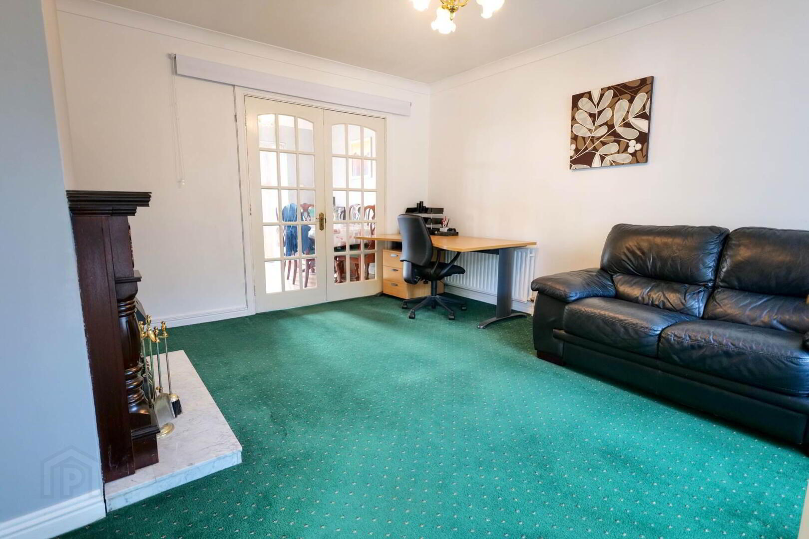 Bay window, feature fireplace with electric fire, carpet flooring, coving, French doors to kitchen/dining area